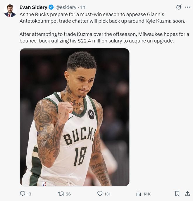 北京时间10月10日,根据NBA记者埃文-斯迪瑞的报道,由于雄鹿队为了确保球队用一场关键的胜利来安抚扬尼斯的情绪,关于库兹马的交易绯闻会再度兴起。