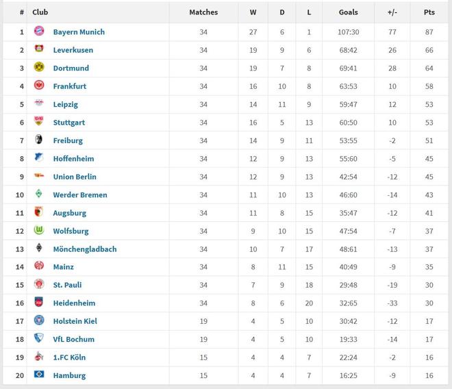德甲2025年度积分榜:拜仁34场仅1负打进107球,领先第二21分